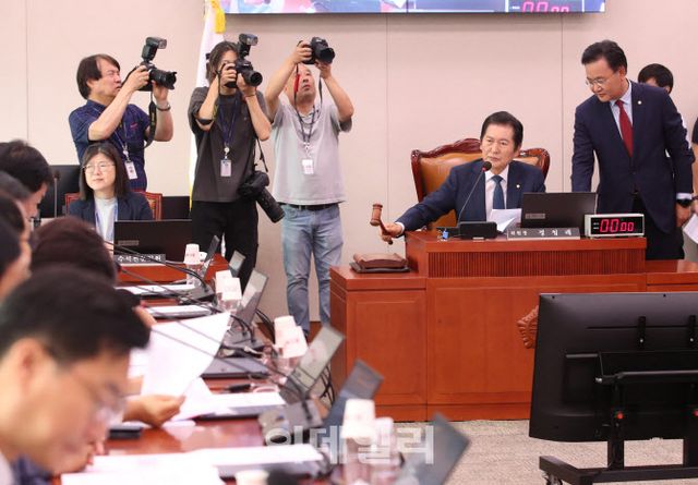 정청래 국회 법제사법위원장이 25일 오전 서울 여의도 국회에서 법제사법위원회 전체회의를 개의하며 의사봉을 두드리고 있다. 유상범 국민의힘 의원이 의사일정 진행과 관련해 항의하고 있다.(사진=노진환 기자)