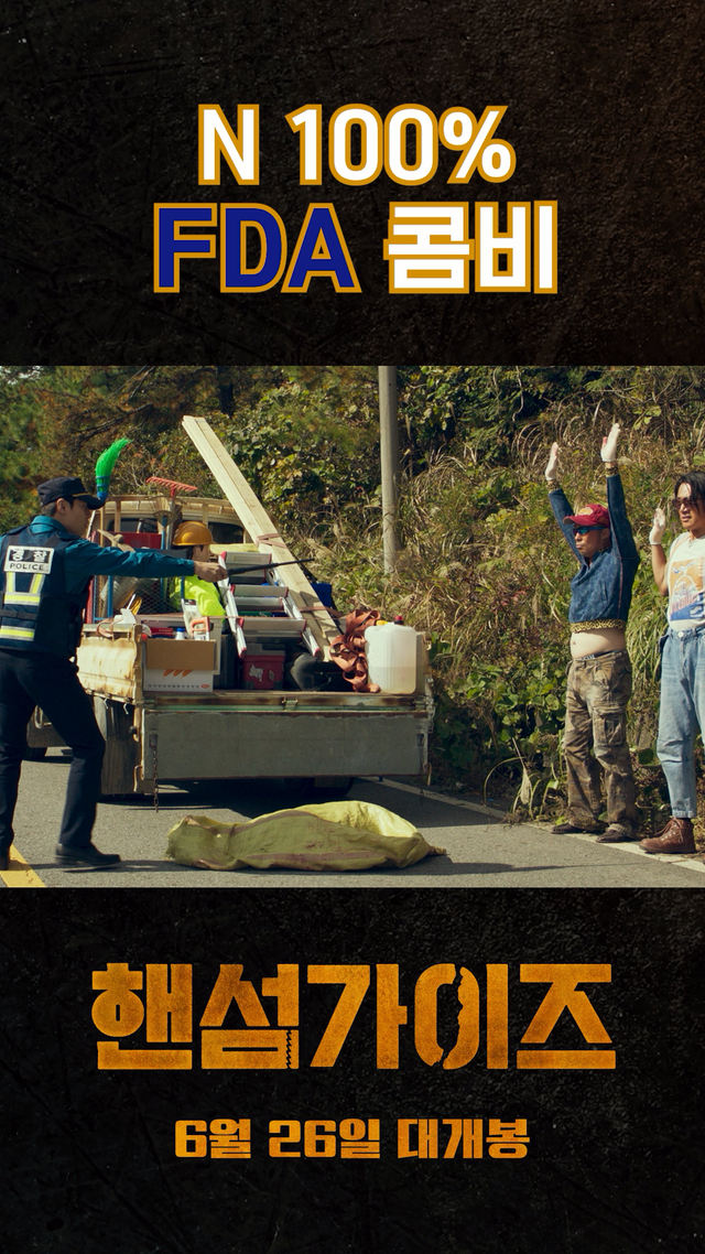 마지막은 순찰 도중 도로 위에서 수상한 움직임을 펼치는 ‘재필’과 ‘상구’를 발견한 ‘최 소장’(박지환)과 ‘남 순경’(이규형)이 등장하는 ‘N 100% FDA 콤비’ 쇼츠다. 험상궂은 표정으로 피 묻은 포대자루를 옮기던 ‘재필’과 ‘상구’의 모습은 의욕충만한 ‘최 소장’의 레이더에 포착되고, 경찰의 촉과 N 성향의 상상력이 100% 발휘되어 두 사람을 범죄자로 의심한다. ‘최 소장’의 “동작 그만!” 한 마디에 ‘재필’과 ‘상구’는 팔을 번쩍 드는데, 유독 팔을 높이 들어 올린 ‘재필’의 하얗고 뽀얀 뱃살이 드러나 시선을 강탈하며 재미를 더한다. 하지만 포대자루에서 까만 흑염소가 발견되어 똥(?) 촉이었음이 드러나 본편 속 활약에 기대를 고조시킨다. 이처럼 1분이 넘지 않는 짧은 영상임에도 불구하고 '핸섬가이즈' 가 지닌 높은 타율의 웃음을 확실히 드러낸 ‘웃음폭탄 투척 쇼츠.ZIP’은 관객들의 예매를 서두르게 만들 전망이다.