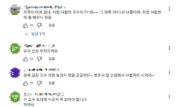 해당 사연이 올라온 유튜브 채널 'JTBC News'에는 교수를 비난하는 댓글이 쏟아졌다. 한 누리꾼은 "갑질 교수는 자격 박탈해야 한다"고 분노했으며, 다른 누리꾼들 역시 "조폭이 따로 없네. 이런 사람이 교수라고?" "저 교수 어떤 사람인지 정말 궁금하다" "저런 인간이 무슨 교육자냐" 등의 반응을 보였다.