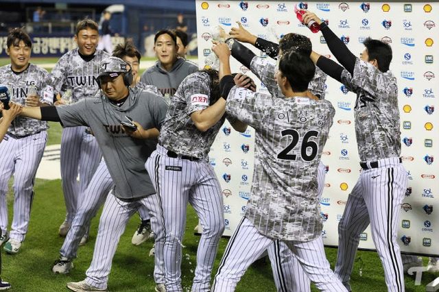 1안타 완봉승을 거둔 LG트윈스 케이시 켈리가 동료들로부터 축하 물세례를 받고 있다. 사진=LG트윈스
