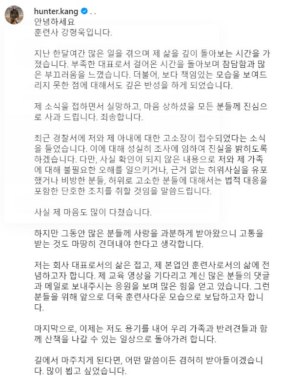 다만 허위사실 유포나 비방 등에는 단호히 대처하겠다는 입장이다. 강형욱은 "사실 제 마음도 많이 다쳤다. 하지만 그동안 많은 분들께 사랑을 과분하게 받아왔으니 고통을 받는 것도 마땅히 견뎌내야 한다고 생각한다"고 부연했다.
