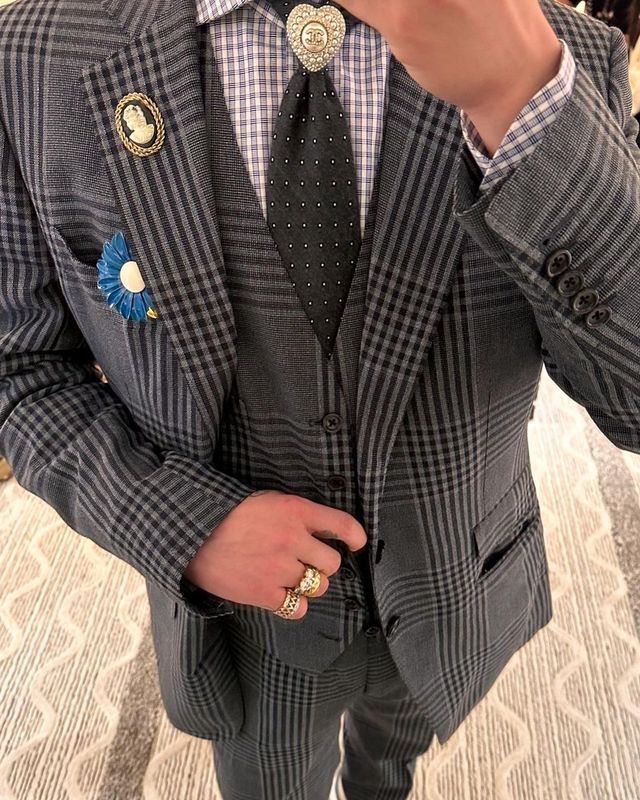 뱃지나 다름없으니까요. 반짝이는 큐빅부터 클래식한 펜던트, 진주까지, 그의 취향은 한 가지에만 매몰되지 않습니다. 게다가 단 한 개가 아닌 여러 개의 브로치로 과감한 믹스매치를 즐기는가 하면, 트위드 재킷이나 셔츠처럼 조심스레 다룰 만한 소재에도 고민 없이 레이어링을 선보이죠.