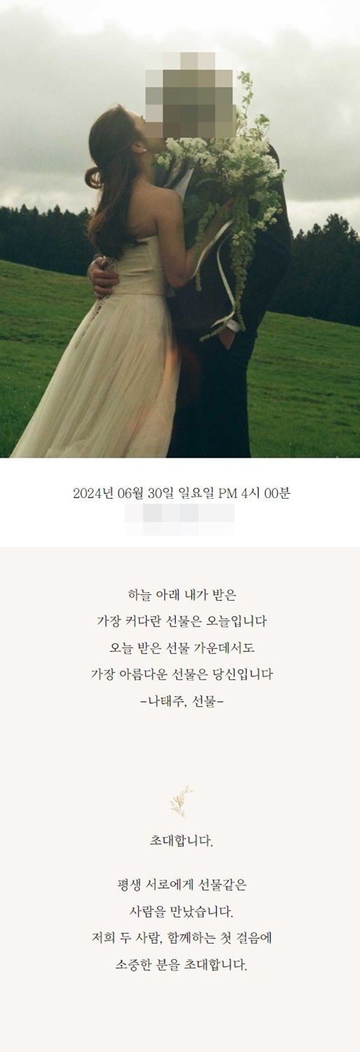 청첩장에는 '하늘 아래 내가 받은 가장 커다란 선물은 오늘입니다. 오늘 받은 선물 가운데서도 가장 아름다운 선물은 당신입니다'라는 나태주 시인의 시 '선물'의 구절이 담겨 있어 서로에 대한 애정을 짐작하게 한다.