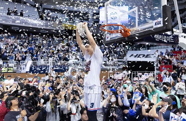지난달 5일 오후 경기도 수원시 권선구 수원KT소닉붐아레나에서 열린 '2023-2024 정관장 프로농구' 챔피언결정전 5차전 수원 KT와 부산 KCC의 경기에서 우승을 차지한 KCC 허웅이 그물 커팅 세리머니를 하고 있다. 이날 경기에서 부산 KCC는 수원 KT를 상대로 88대70으로 승리를 거두며 정규리그 5위팀 최초이자 통산 여섯 번째 우승을 거뒀다. / 뉴스1