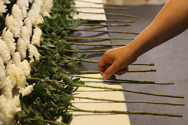 26日,在京畿道华城市厅进行ARICELL工厂火灾遇难者追悼会,追悼者献上吊唁花。【图片提供 韩联社】
