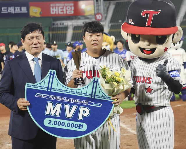 (부산=연합뉴스) 강덕철 기자 = 14일 오후 부산 사직야구장에서 열린 프로야구 퓨처스 올스타전 시상식에서 LG 김범석이 MVP를 수상하고 있다. 2023.7.14 kangdcc@yna.co.kr/2023-07-14 21:22:26/ <저작권자 ⓒ 1980-2023 ㈜연합뉴스. 무단 전재 재배포 금지.>