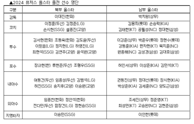 한국야구위원회(KBO)는 5일 2024 퓨처스 올스타전에 출전하는 명단을 발표했다. 북부리그(한화, 두산, LG, SSG, 고양)와 남부리그(상무, 롯데, KIA, KT, NC, 삼성)에서 각각 24명씩 총 48명의 선수가 포함됐다.