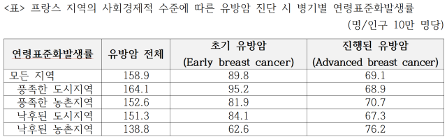 논문의 배경이 되는 프랑스는 한국과 유사하게 2004년부터 국가암검진사업을 통해 50~74세 여성에게 2년마다 유방암 검진을 제공한다. 이러한 제도에도 불구하고 사회경제적으로 낙후된 지역에서 유방암의 발생률은 낮고, 사망률이 높은 이유를 찾아내기 위해 프랑스 서부에 있는 루아르-아틀랑티크(Loire-Atlantique)와 벤디(Vendee) 지역의 2008~2015년 암등록자료와 2011년 프랑스 인구총조사를 바탕으로 산출한 유럽형 지역박탈지수(French European Deprivation Index, F-EDI)를 연계하여 분석했다.