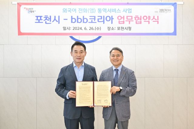 [파이낸셜경제=김영란 기자] 포천시는 지난 26일 (사)bbb코리아와 '외국어 전화(앱) 통역서비스 사업'을 위한 업무협약을 체결했다.