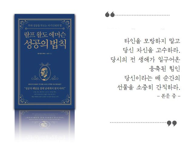 출판사는 "에머슨의 성공 법칙 5가지는 사실 이미 우리 안에 있는 것들"이라며 "(성공 법칙이)내 안에 있다는 것을 믿고, 확신하는 것이야말로 '성공으로 이끄는 제1법칙'임을 잊어서는 안된다"고 강조했다. 노윤기 옮김. 1만7800원. 오은지기자