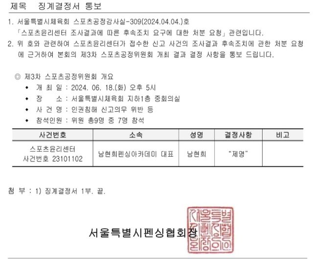 서울시 체육회가 60일 이내 결론을 내면 최종 징계가 확정된다. 이 관계자는 "서울시 펜싱협회가 1심이었다면, 상급 단체인 서울시 체육회가 최종 2심인 셈"이라고 못 박았다.