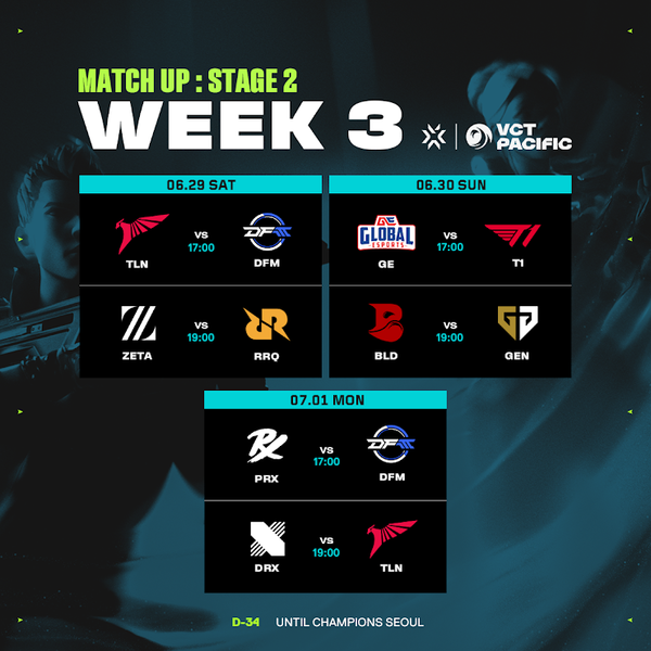 지난 2주 차에서 페이퍼 렉스와 렉스 리검 퀀에게 패배하며 VCT 퍼시픽 정규 리그 첫 연패를 기록한 DRX가 3주 차에서 탈론 이스포츠(TLN)를 만난다. 두 팀의 상대 전적은 3대0으로 DRX가 압도적인 우위를 점하고 있다. 2023년 열린 VCT 록//인 상파울루를 시작으로 VCT 퍼시픽에서 만날 때마다 DRX가 모두 이겼다.