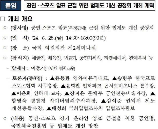 문체부 관계자는 “이번 공청회는 암표 근절을 위한 다양한 관계자의 의견을 수렴하는 의미 있는 자리”라며 “지속적 의견수렴 절차를 통해 암표 근절을 위한 제도 개선안을 마련할 계획”이라고 밝혔다.