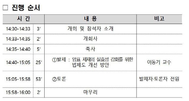 국민대 이동기 법학 교수가 암표 제재의 실효성 강화를 위한 법·제도 개선 방안을 발표한다. 엠와이뮤직 윤동환 대표와 인터파크 윤희진 콘서트비즈니스 본부장, 인하대 소비자학과 이은희 교수 등의 각계 전문가를 비롯해 문체부와 경찰청, 국민권익위원회 등 관련 정부 기관 관계자가 토론자로 참여한다.