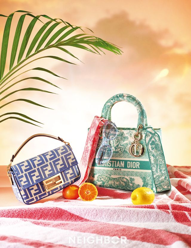Fendi FF 자카드 패브릭 소재 바게트 미니 백 200만원대. Dior 디올리비에라 컬렉션 레이디 디 라이트 백, 캔디 핑크 컬러의 트왈 드 주이 소바쥬 미차 스카프 모두 가격 미정. Bottega Veneta 투명한 라이트 블루 컬러 프레임이 시원한 인상을 전하는 틴티드 선글라스 62만5000원. Chanel 스트라이프 패턴 배스 타월 가격 미정.