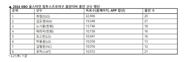 25일 오전 10시부터 27일 오전 10시까지 KBO 올스타 홈페이지와 KBO 공식 앱에서 총 이틀 동안 실시된 홈런더비 출전 선수 선정 팬 투표에서 득표 1위를 차지한 SSG 랜더스 최정(2만 2906표)을 비롯해 KIA 타이거즈 김도영(1만 9248표), 한화 이글스 노시환(1만 3746표), 요나단 페라자(1만 158표), LG 트윈스 오스틴 딘(1만 41표), 박동원(1만 0036표), NC 다이노스 김형준(1만 0016표), KT 위즈 멜 로하스 주니어(1만 12표)가 득표수 상위 8명의 선수로 최종 출전한다.