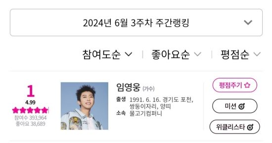 아이돌차트에 따르면, 지난 6월 21일부터 6월 27일까지 집계된 6월 3주 차 평점랭킹에서 임영웅은 39만 3,964표를 얻어 최다득표를 기록했다.
