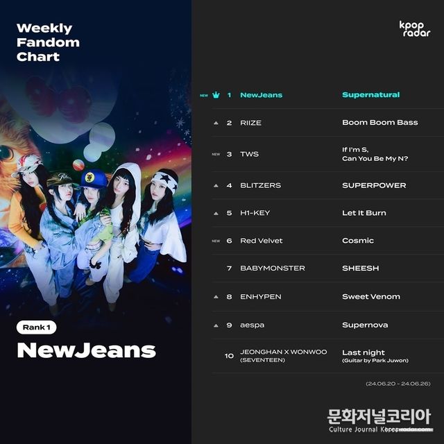 문화저널코리아 김영일 기자 | 걸그룹 뉴진스(NewJeans)가 미국 전역으로 방송되는 케이팝 전용 차트쇼 ‘케이팝레이더 (K-POP RADAR)’의 위클리 팬덤 차트에서 1위를 차지했다.