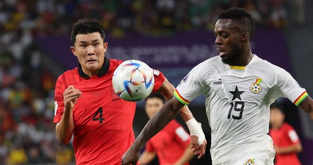 2022년 11월 28일 오후(현지 시각) 카타르 알라이얀 에듀케이션 시티 스타디움에서 열린 2022 카타르 월드컵 조별리그 H조 2차전 대한민국과 가나의 경기에서 김민재가 윌리엄스와 치열한 볼다툼을 벌이고 있다. / 뉴스1