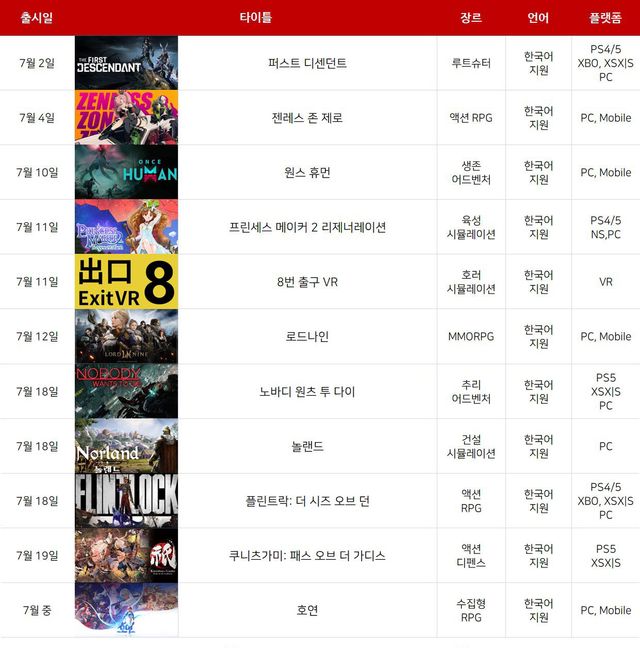어느새 상반기가 끝나고 7월이 코앞으로 다가왔습니다. 그간 진여신전생: 벤전스, 엘든 링: 황금 나무의 그림자 등 많은 작품들이 게이머를 즐겁게 해줬지만, 더위를 잊게 해줄 더 많은 작품이 필요한 시점입니다. 이에 화답하듯 오는 7월에도 퍼스트 디센던트, 젠레스 존 제로 등 쟁쟁한 작품들이 출시를 앞두고 있는데요, 과연 7월에는 어떤 게임들이 게이머들의 더위를 잊게 해줄지 정리하는 시간을 마련했습니다.