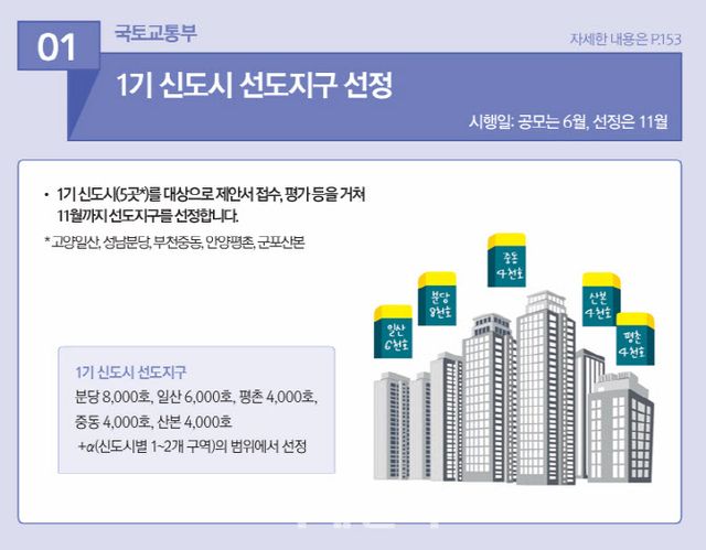 선도지구는 지역주민 동의 여부, 정주환경 개선의 시급성, 도시기능 활성화의 필요성, 모범사례 확산 가능성 등을 고려하여 우선적으로 정비사업이 실시되는 곳이다. 앞서 국토부는 선도지구를 분당 8000호, 일산 6000호, 평촌 4000호, 중동 4000호, 산본 4000호 범위 내에서 각 도시별 1~2개 구역을 추가해 선정할 수 있다고 밝힌 바 있다.