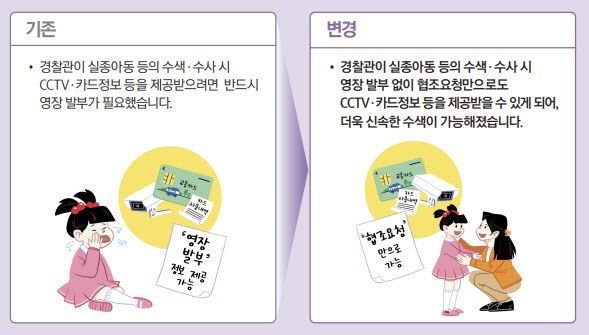 실종아동 등은 실종 후 발견까지 시간이 길어질수록 강력범죄나 사고에 노출될 우려가 높아 빠른 수색 조치가 중요하지만, 그동안 경찰은 경로추적에 필요한 정보를 요청할 법적 근거가 없어 적시성 있는 수색에 어려움을 겪었다. 하지만, 이번 법 개정으로 CCTV 영상과 신용·교통카드 사용내역, 진료일시 및 장소 등 정보를 제공받을 수 있게 됐다. 만약 이를 위한 경찰관의 요구를 부당하게 거부할 경우 1년 이하의 징역이나 1000만원 이하의 벌금을 받을 수도 있다. 다만, 경찰관이 해당 정보를 실종아동 등 발견 목적이 아닌 다른 목적으로 사용하면 더 큰 처벌(5년 이하 징역 또는 5000만원 이하 벌금)을 받게 된다.
