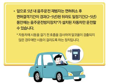 우선 오는 10월 25일부터 상습적인 음주운전을 예방하기 위해 음주운전 재범자를 대상으로 음주운전 방지장치를 부착하는 조건부 운전면허제도가 도입된다. 이는 음주운전으로 적발된 사람이 5년 이내에 다시 음주운전으로 단속되는 경우 일정기간 (2~5년) 동안 음주운전 방지장치가 설치된 자동차만 운전해야 하는 내용을 담고 있다.