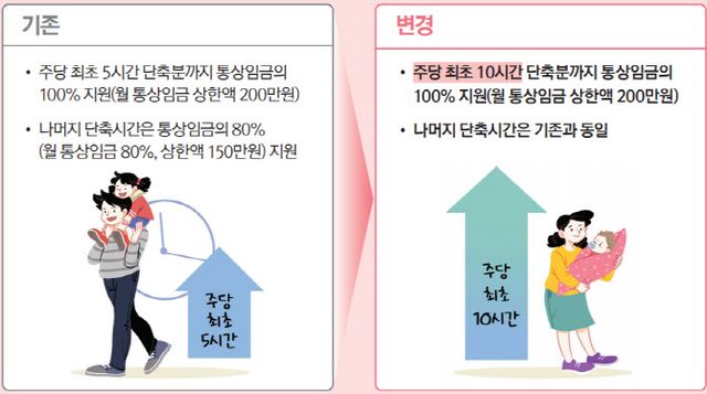 | ‘육아기 근로시간 단축급여’ 100% 지원범위 확대 내용.(자료=고용노동부) |