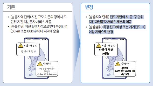 기상청은 현재 지진 규모에 따라 지진 발생지점을 기준으로 특정반경(50㎞ 또는 80㎞) 이내 지역에 재난문자를 보냈지만, 오는 10월부터는 지진 발생시 지진동의 세기와 피해발생 가능성을 고려한 진도 기반으로 지진 재난 문자를 송출하도록 개선할 방침이라고 밝혔다. 여기에 광역시·도 단위로 재난문자를 송출하는 방식도 시·군·구 단위로 세분화해 이뤄질 예정이다.