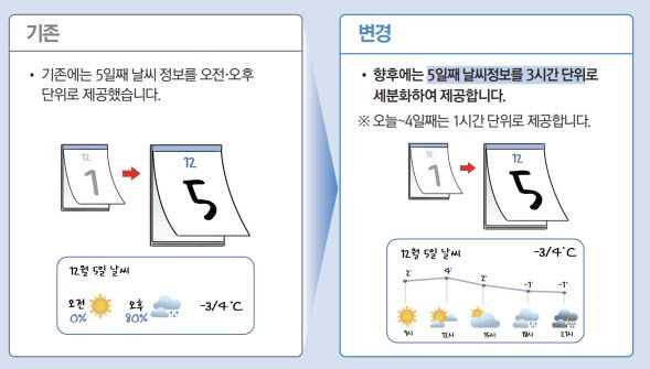 또한 지금은 5일 후 날씨 정보를 오전·오후 단위로 확인할 수밖에 없었지만, 오는 11월부터는 3시간 단위로 확인할 수 있게 된다. 4일째까지는 1시간 단위로 날씨정보를 확인할 수 있어 예보의 변동성에 대응할 수 있게 될 전망이다. 국민 생활에 많은 영향을 미치는 눈·비 예보는 국민의 이해도를 높이기 위해 정량의 예상강수량 및 적설량과 함께 ‘약한 비, 많은 눈’ 등 정성적인 정보도 함께 제공할 예정이다.