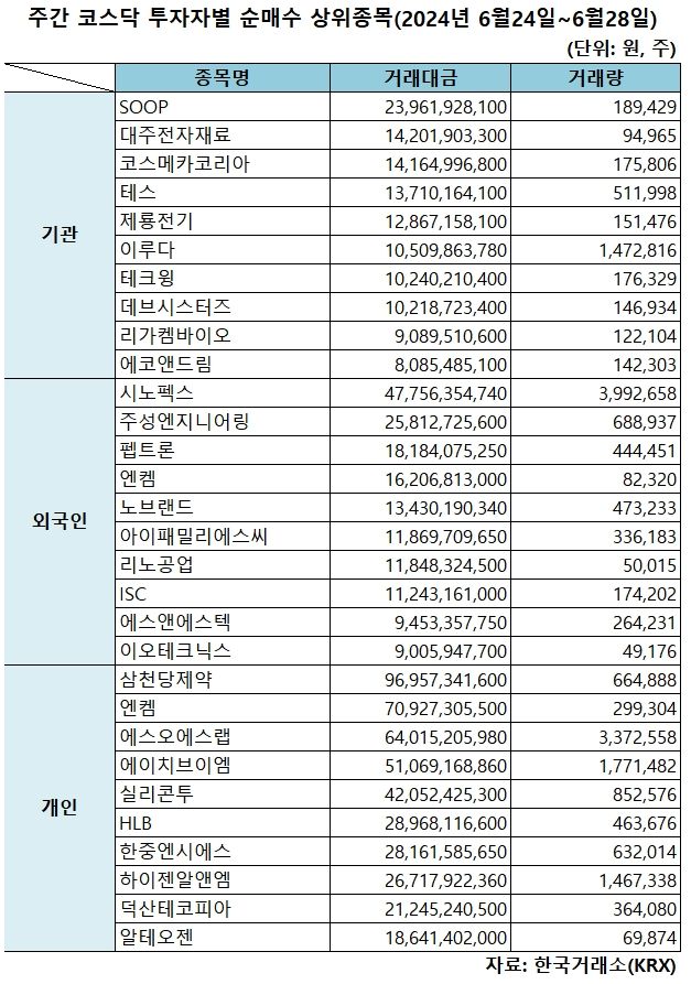 기관 'SOOP'·외인 '시노펙스'·개인 '삼천당제약' 1위 [주간 코스닥 순매수- 6월24일~6월28일]