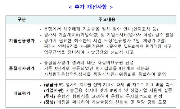 기술 신용 평가 관련해선 최소한의 평가 시간 보장, 평가사 인력 요건을 자체 평가 은행 기준으로 일원화, 업무 규범 정비 등의 내용이 추가됐다. 품질 심사 평가 결과에 대한 재심의 요구권도 신설했다. 테크평가에선 평가액 지표를 잔액 지표로 대체했다. 또 지식재산(IP) 평가와 창업지원 기업에 집중하기로 했다.