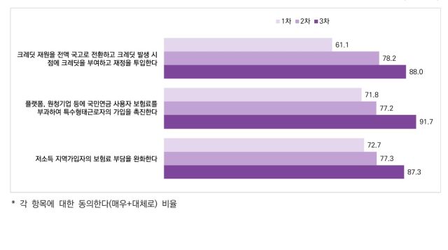 '크레딧' 재원을 전액 국고로 전환하고 크레딧 발생 시점에 크레딧을 부여하고 재정을 투입하는 방안에는 88%가 찬성했다. 크레딧은 사회적으로 가치 있는 행위에 대한 보상으로 국민연금 가입기간을 추가 인정하는 제도인데, 이의 강화에 시민 대부분이 동의한 것이다.
