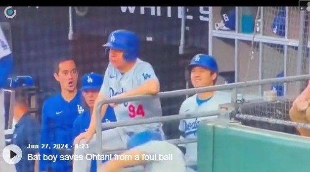하지만 다저스엔 든든한 가드가 있었다. 볼보이(배트보이) 하비에르 에레가가 오타니 바로 앞에서 날아온 공을 맨손으로 잡아낸 것. 오타니가 황급히 고개를 숙인 상황이었다.