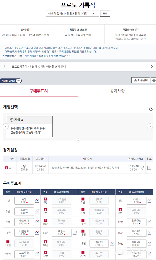‘프로토 기록식 47회차 X게임’은 6월 3일(월) 발매를 개시해 7월 14일(일) 오후 9시50분까지 구매가 가능하며, 최초 발매 개시 후 24개국을 선택할 수 있었던 초반과 달리 현재는 12개국으로 선택지가 줄었다.