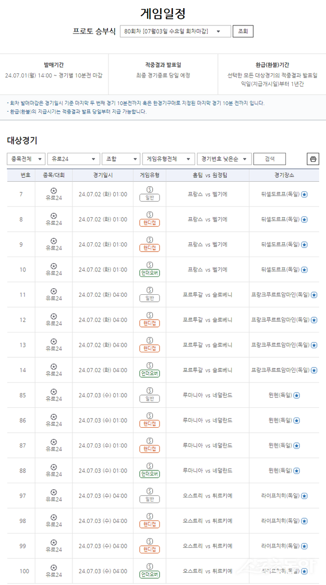 ‘프로토 승부식 80회차’에서 유로2024 16강전을 대상으로 하는 게임은 ▲프랑스-벨기에(7~10번) ▲포르투갈-슬로베니아(11~14번) ▲루마니아-네덜란드(85~88번) ▲오스트리아-튀르키예(97~100번)다.
