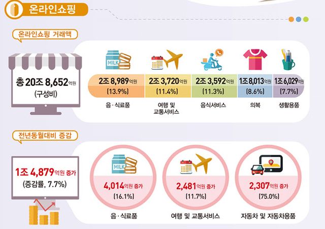 온라인 장보기가 늘어나면서 음식료품(16.1%)도 크게 늘었고, 배달음식 플랫폼에서 할인 행사를 하면서 음식서비스도 11.3% 늘어났다. 이외에도 여행·교통서비스(11.7%)도 높은 증가율을 보였다.