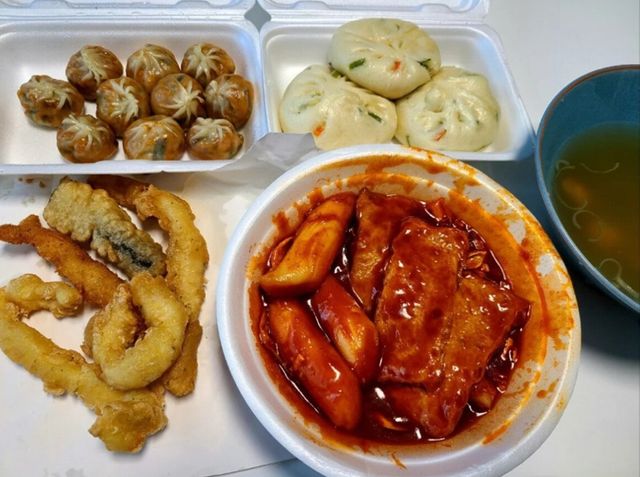 떡볶이 1인분 3000원 + 튀김 1인분 2000원 + 김치만두 10개 2500원 + 왕만두 3개 2500원. 도합 1만원어치였다. 어묵 국물은 서비스.