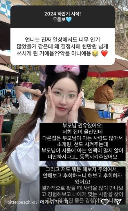 이어 "그리고 저도 뭐든 해보자 주의여서.. 안 해보고 후회하느니 해보고 후회하자였다! 결과적으로 봤을 때 사람을 많이 만나보고 경험해보고 나에게 맞는 사람을 찾아갈 수 있게 된 좋은 경험이었다"라고 전했다.
