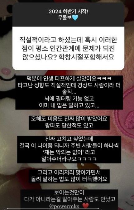 이어 "직설적인 성격 덕분에 인생 터프하게 살았다. 타고난 성향도 직설적인데 경상도 사람이라 더 솔직.. 뇌에 필터링 기능 없고 이미 내 입은 말하고 있고..."라며 "오해도 미움도 진짜 많이 받았다. 왕따도 당한적도 있고"라며 왕따를 당했던 사실을 고백했다.
