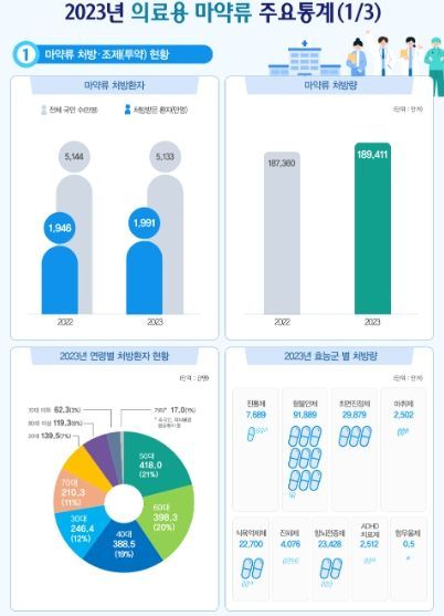 지난해 의료용 마약류를 처방받은 환자는 1,991만 명, 처방량은 18억 9,411만 개로 집계되어, 전체 환자 수는 전년 대비 45만 명이 증가했으며, 처방량도 2천 51만 개가 늘어났으나 1인당 처방량은 약간 감소했다.
