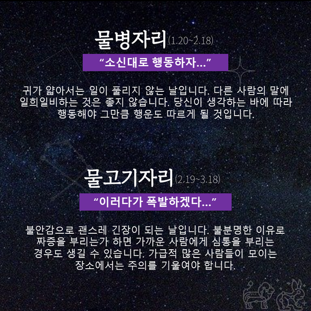 불안감으로 괜스레 긴장이 되는 날입니다. 불분명한 이유로 짜증을 부리는가 하면 가까운 사람에게 심통을 부리는 경우도 생길 수 있습니다. 가급적 많은 사람들이 모이는 장소에서는 주의를 기울여야 합니다.