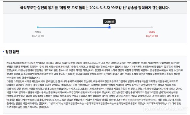 KBS가 지난 6월 6일 방영한 ‘스모킹건 2 – 아내가 욕조에 넘어져 죽었어요’ 편에 대해 해명했다. KBS 측은 방송에서 게임을 결정적 살해 동기로 묘사하지 않았고, 게임과 게이머 명예를 훼손할 의도가 없었다고 밝혔다. 다만 해명한 부분과 방송 내용이 일치하지 않는 부분이 있어 면피성 해명이 아니냐는 지적이 일었다.