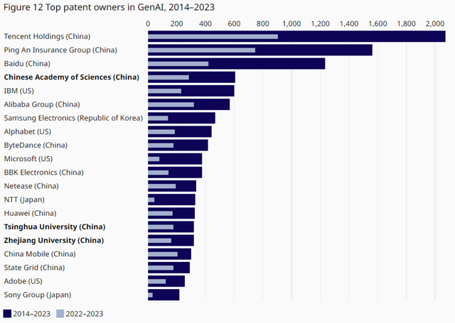 생성형 인공지능(AI) 기술 특허 분야에서 중국이 다른 국가들보다 훨씬 앞서 가고 있다는 연구 결과가 발표됐다. 중국은 미국보다 6배 더 많은 특허를 출원하고 있는 것으로 나타났다.