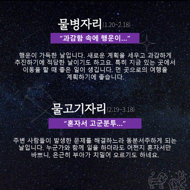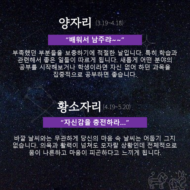 커플인 분이라면 상대방과 함께 하는 짧은 여행도 좋습니다. 기분도 전환하고 상대방을 향한 사랑을 좀더 키울 수도 있고요. 싱글인 분의 경우 편안한 만남이 아니라면 피하세요. 오늘 당신의 컨디션이 최상은 아니니 괜스레 나쁜 인상만 심어줄 수 있습니다.
