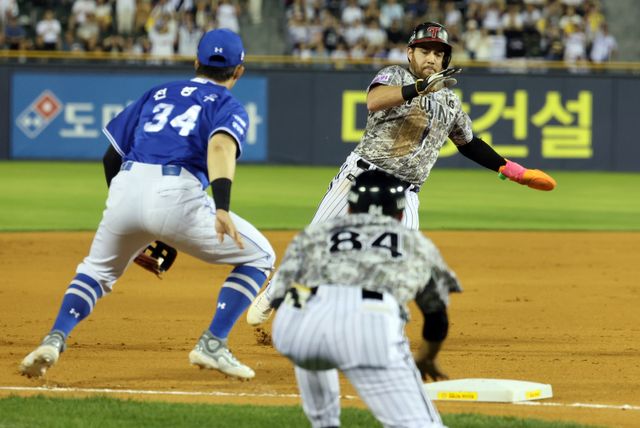 26일 오후 서울 잠실야구장에서 열린 프로야구 삼성과 LG 경기. LG 오스틴이 7회 중전 안타로 진루한뒤 후속 박동원 타석때 2루 도루하려다 공이 빠지는 바람에 3루까지 진루하고 있다. 잠실=정시종 기자 capa@edaily.co.kr /2024.06.26.