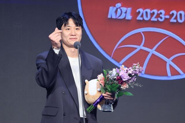 2024년 4월 1일 오후 서울 강남구 그랜드인터컨티넨탈 서울파르나스에서 열린 2023-2024 정관장 프로농구 시상식에서 부산 KCC 허웅이 인기상을 받은 뒤 소감을 밝히며 팬을 향해 손가락으로 하트를 만들어 보인다. / 연합뉴스