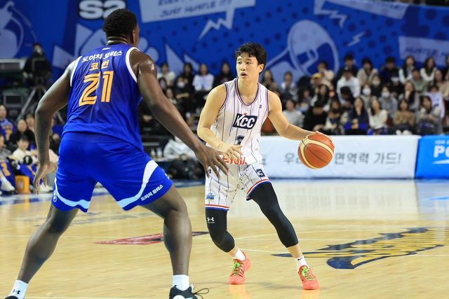 2024년 2월 4일 서울 잠실실내체육관에서 열린 프로농구 정규리그 서울 삼성과 부산 KCC의 경기에서 KCC 허웅이 드리블하고 있다. / 연합뉴스