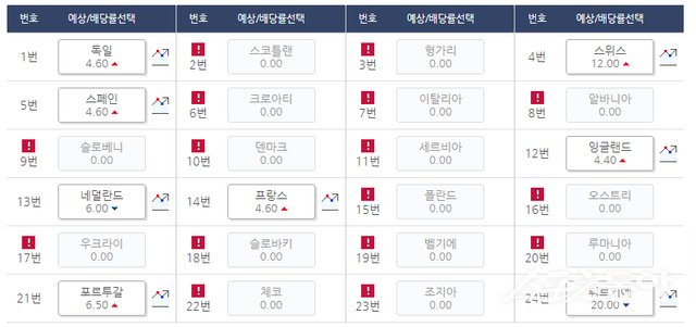 반면 가장 높은 배당률을 받은 국가는 튀르키예다. 튀르키예는 8개국 중 최고 배당률(20.00배)을 기록했고, 나머지 국가들은 네덜란드(6.00배)~포르투갈(6.50배)~스위스(12.00배)의 순으로 집계됐다.