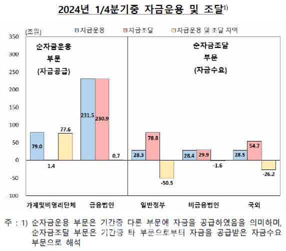 기업(비금융법인)은 순조달 규모가 축소됐다. 기업의 당기순이익이 증가한 가운데, 유·무형 자산 투자는 줄어든 영향이다. 순조달액은 1조6000억원으로 전분기(6조9000억원) 대비 5조3000억원 줄었다.